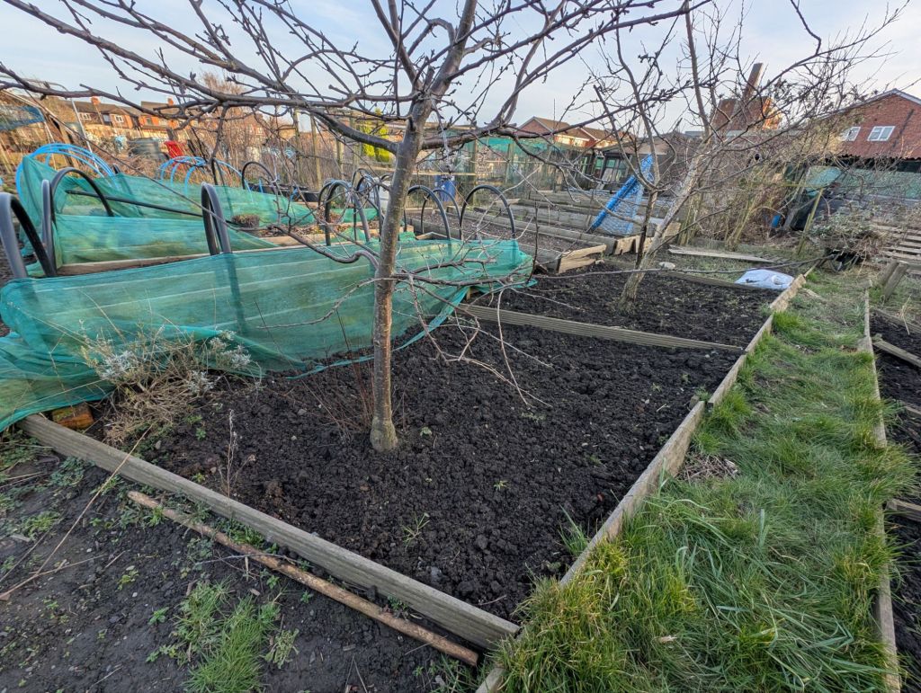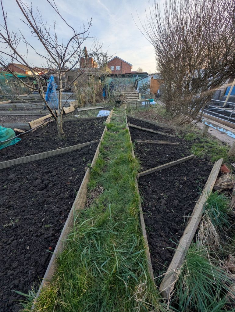 Over the weekend, the weather was actually dry. Dry! Without precipitation of any type! No rain, snow, sleet, hail! After spending several long moments in utter shock at a large yellow circular thing in the sky – I believe it has a name, but I couldn’t remember the technical term for it – we headed down to the allotment to begin preparing for the new growing season.