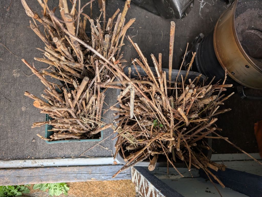 In the meantime, my husband was busy hoeing the beds ready for our new crops. One section by the bog garden has been used as storage for all the willow cuttings over winter. Happily, these have now dried out and I collected, broken them down and stored them in the shed ready to be used in our EcoZoom stove. I’m always struggling for small bits of wood to get it going and there are always tons of willow cuttings which take up huge amounts of space on the compost heap. Pleased with my stash of firelighters, I moved onto checking on our chickens.