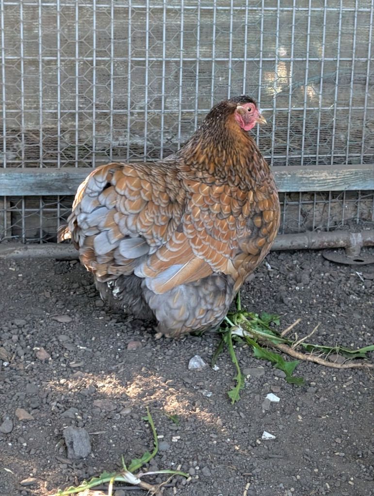 In the run, I discovered that the run-side door was open, in my rush to sort out the nest boxes, I had forgotten to close this door! Shutting it with a bang, I went back to the Nest House, finished putting in the new bedding and dragged the rest of the bedding over to the New Coop. That nest box is deceptive. It doesn’t look like it would need that much bedding but it swallowed nearly half the Easibed. As I finished, Andrew appeared with some weeds to give to the chickens. Feeling rather like I was rewarding Foxy and Bonny for their bad behaviour, I threw the dandelions into the run where they were immediately gobbled up.