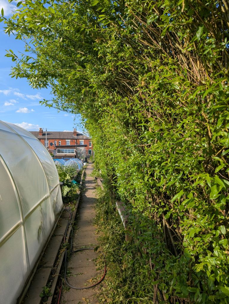 Next I headed over to the willow and began to trim it along both sides. The top is challenging as I don’t have a ladder and the electric hedge trimmer which would make the job doable. Happily, a fellow allotmenteer offered to trim the top for us over the next few days. We chatted about the height and I left it in his capable hands. By now I was melting, so I headed home to try and cool off. As I walked towards the gate, I stopped by to say hello to Jason and Nic who very kindly gave me two beautiful yellow spherical cucumber plants which I took home to keep a close eye on.