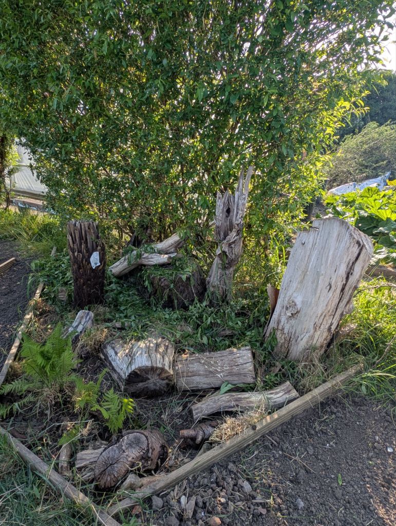 I gave up on the strawberry bed and headed down the plot to weed the stumpery. Using the secateurs, I cleared the worst of the grass and was delighted to discover the ferns were still alive! I definitely need to get some more to fill out the space between the logs and to grow one on the top of the dead tree fern. Even if it’s not alive, it can at least look like it!