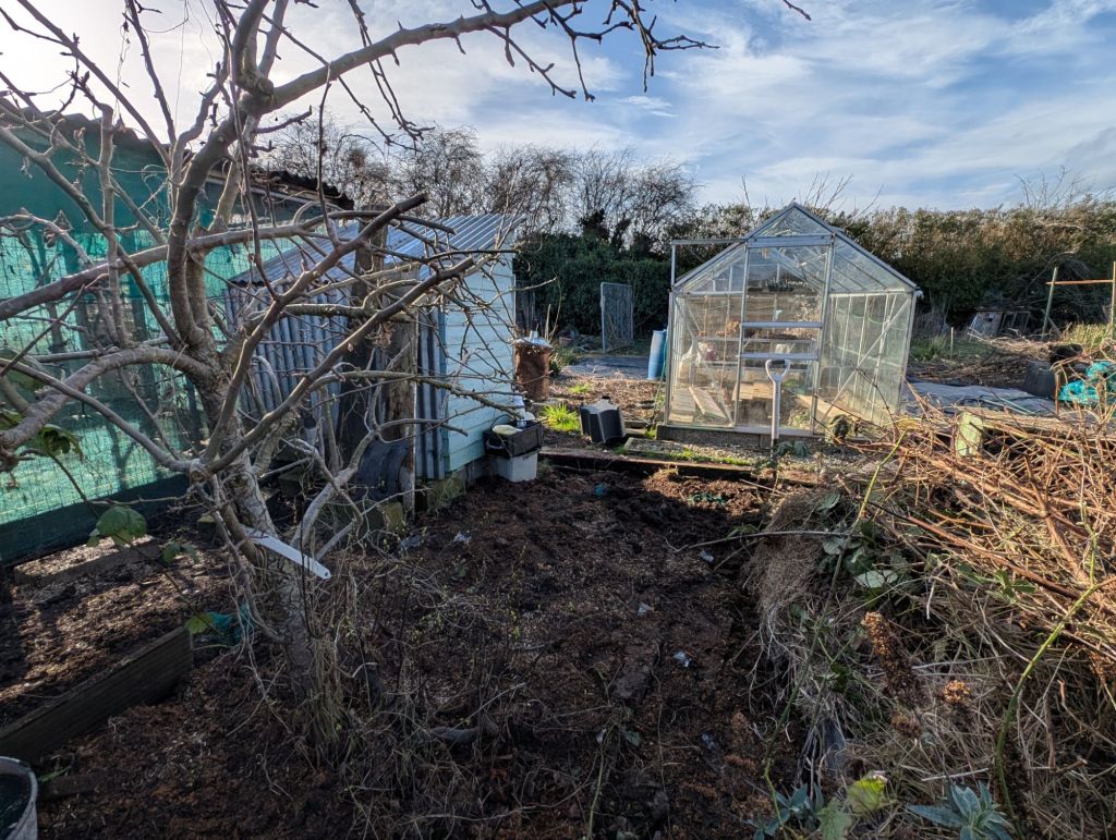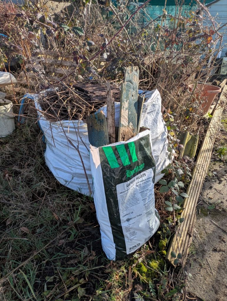 Today, we headed down to the plot to clear around the main coop. We’ve had an ongoing rat issue which has been superbly dealt with by our site pest controller. It’s taken him weeks and required us to move Greta and Flo from the main coop, a ton (quite literally) of rat poison and endless patience to get them all. The roof of the main coop continues to deteriorate especially with the relentless rain we seem to have had almost every single day since New Year’s Day. Honestly, I don’t think I can remember a wetter winter since we moved here twelve years ago! If there is any hint of a hosepipe ban this summer, it’s a sign that someone at the water company has the water level graph upside down.